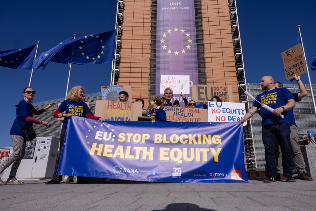 Την Τετάρτη 18 Μαρτίου, οι συνεργάτες μας στο AHF Europe πραγματοποίησαν συντονισμένη διαμαρτυρία στις Βρυξέλλες με το σύνθημα «EU: Stop Blocking Health Equity». Ακολούθησε συνέντευξη τύπου με τη συμμετοχή εκπροσώπων των: AHF Europe, Θετική Φωνή (Ελλάδα), GAT Grupo de Ativistas em Tratamentos (Πορτογαλία) και Asociacija Demetra (Λιθουανία), καλώντας την Ευρωπαϊκή Επιτροπή να στηρίξει την παγκόσμια ισότητα στην υγεία. Μπορείτε να παρακολουθήσετε τη συνέντευξη τύπου εδώ.